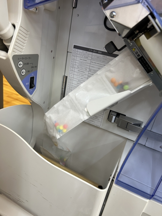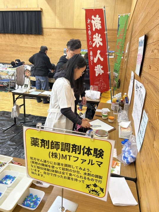自動分包機での一包化、お薬のピッキング、軟膏、水剤の調剤体験をしてもらい、中々体験することができない薬剤師の調剤室でのお仕事を体験してもらいました。全て食べられるお菓子やジュースで行い、自分で調剤したお薬(お菓子)をお土産に持って帰ってもらいました。